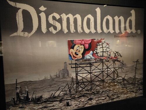 バンクシーにかかると文化や倫理も崩壊する。 中でも驚いたのはディズニーランドではなくディズマランド。 子供が行きたくなくなる遊園地というコンセプトはまさにコロナ禍のデストピア。平和とはほどとおい世界。 この世の中をデストピアと位置づけする作品…